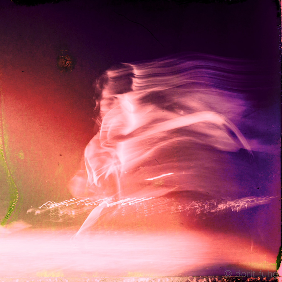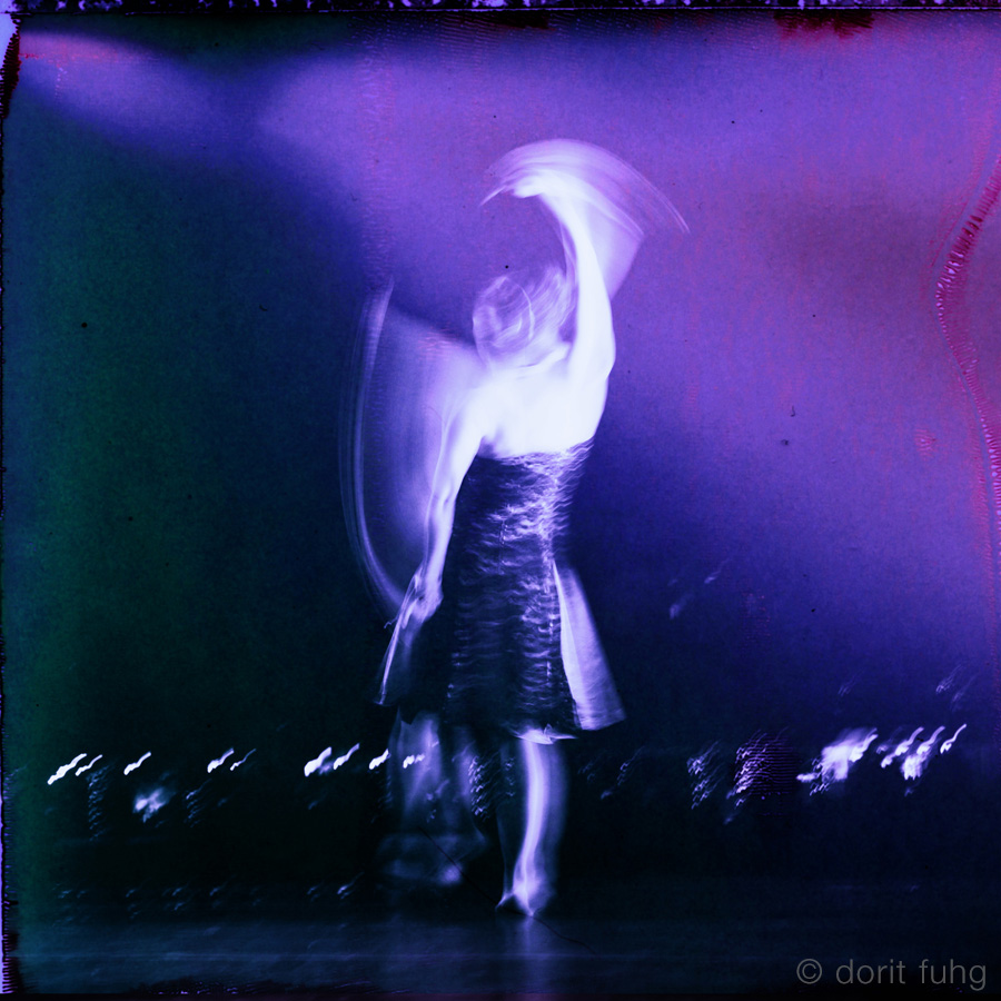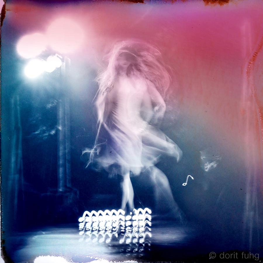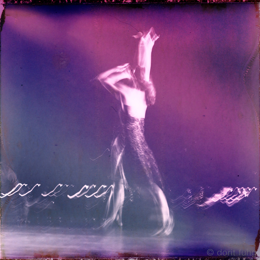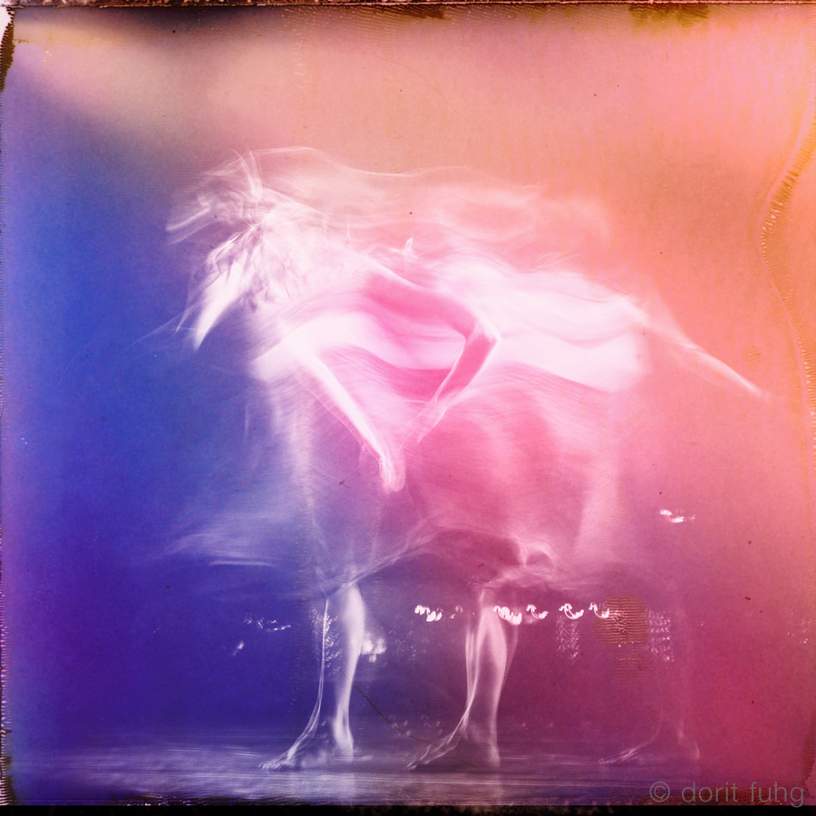 I was mesmerized by the energy and sensuality of the dancers. To emphasize this and to capture the movements, I used a slow shutter speed. The original black & white images were then superimposed on a Mamiya Polaroid with added color to give it a vibrant feel.